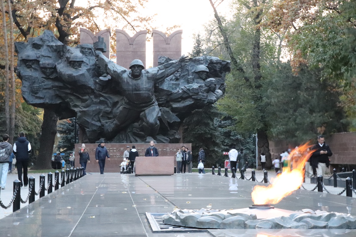 第二次世界大戦時、カザフスタンをはじめとした中央アジアから出征し、モスクワ防衛のために果敢に戦った兵士たちへの慰霊碑です。像が手を広げて守る後ろにはクレムリンの壁があります。