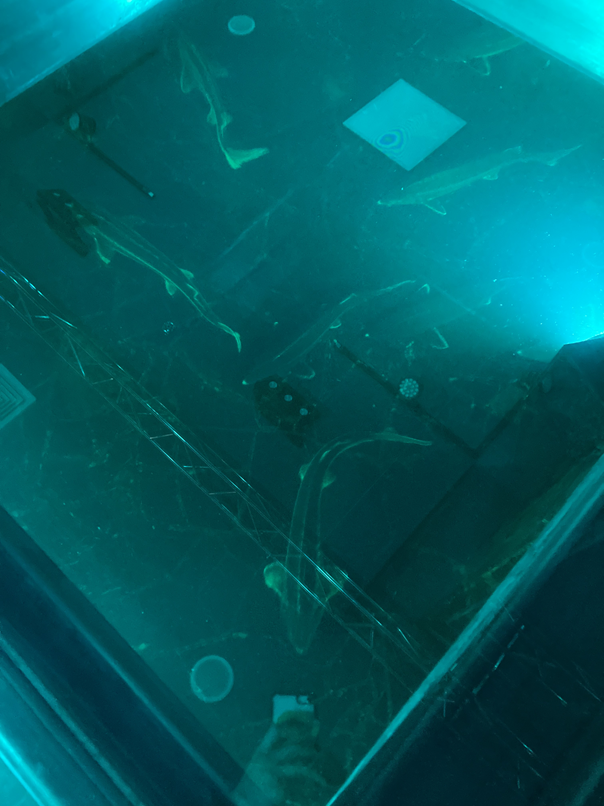 ホテルの地下にはなんとチョウザメの養殖施設があり、水槽からチョウザメがゆっくり泳ぐ様子を見ることができます。