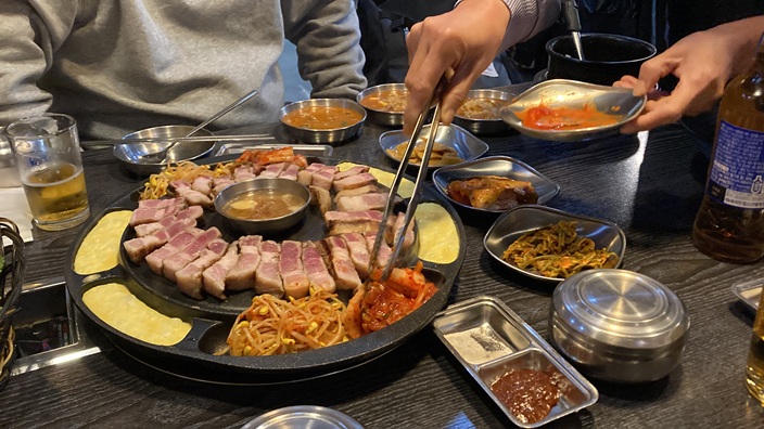仁川空港から電車で10分ほどの『雲西(ウンセオ)』でサムギョプサルを食べました。